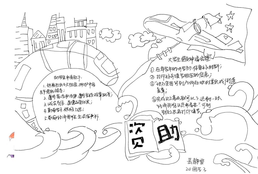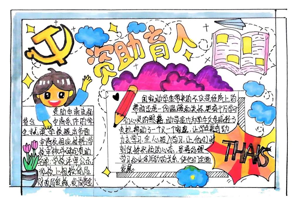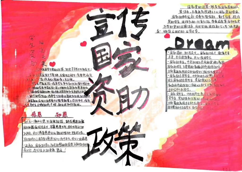 在本次活动中,同学们广泛收集相关资料,精心设计作品版面,运用手中的笔,创作出了一部又一部内容丰富、形式多样的作品。作品色彩与活动主题相应,构思独特,内容丰富,图文并茂,体现出同学们对国家资助政策的深刻理解。此次活动,经过评委人员的认真筛选,最终选出一等奖一名,二等奖两名,三等奖三名。