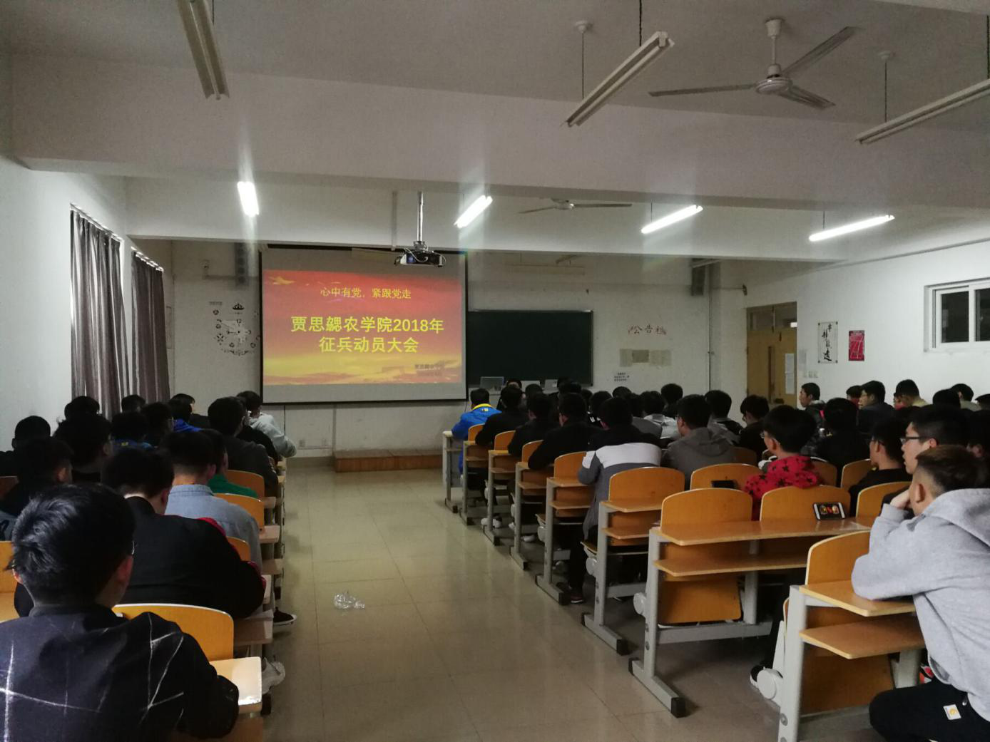 为积极响应国家大学生征兵工作的号召,巩固国防建设,不断为军队注入新鲜血液,2018年4月13日,437ccm必赢国际于教学楼208室举办2018年度征兵宣传动员大会,农学院李建永副书记、刘建伟老师及各年级100多名男同学参加会议。