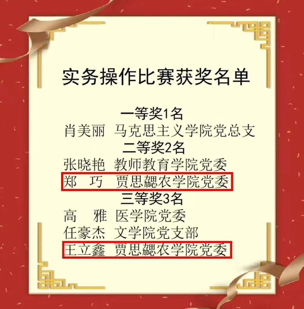 在基层党组织评优中,必赢党委以优异的成绩斩获“优秀组织奖”,这既是学院党委党建规范化建设的成果体现,又是全院上下凝心聚力、务实笃行的生动注脚。未来,必赢党委将以大赛为契机,持续深化"党建+"育人模式,将竞赛成果转化为推动教学科研、服务乡村振兴的实际行动,在新时代党建工作中勇毅前行,为培育知农爱农新型人才贡献更大力量!
