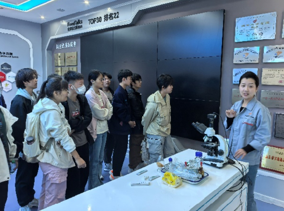实习期间,学生分组走进智能工厂,观摩玉米深加工产品从原料预处理到成品的全流程生产,产线负责人结合自动化设备解析精益管理逻辑;在研发中心,学生零距离接触微生物菌种培育、酶制剂开发等核心实验室,与研发团队探讨技术从概念到产业化的路径;企业展厅内,通过产品矩阵与互动展示,学生深入理解生物基材料、功能性食品添加剂等技术原理与应用场景。校企座谈会上,企业负责人还围绕行业趋势,剖析了生物技术领域对“技术+管理”复合型人才的需求标准。