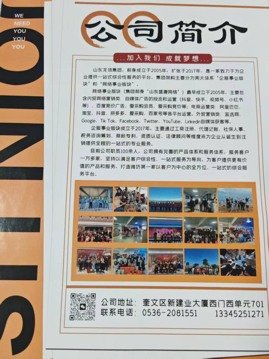 山东龙顶集团作为专注企业一站式综合服务的平台,山东龙顶集团业务覆盖企业事业与网络事业两大体系。此次招聘聚焦销售领域,提供销售专员、销售经理等岗位,专业不限,薪资待遇为7000-8000元,有意者可致电13345251271咨询。