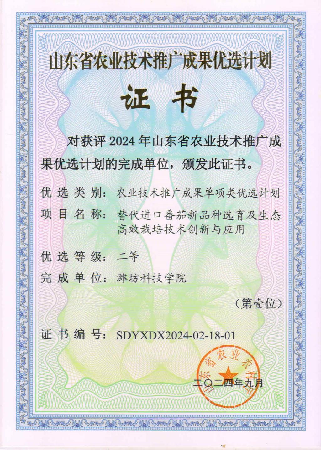 近日,山东省农业农村厅公布了2024年山东省农业技术推广成果优选计划项目(原农林牧渔丰收奖)名单,我校作为第一完成单位,联合山东农业大学、三木种苗、山东省农业技术推广中心等单位申报的‘替代进口番茄新品种选育及生态高效栽培技术创新与应用’项目喜获单项类优选计划二等奖。本奖项充分体现我校近年来开展科技创新、服务农业生产的积极性、创造性,也是潍坊科技学院引导产学研推用各方团结协作、联合攻关的代表性成果。