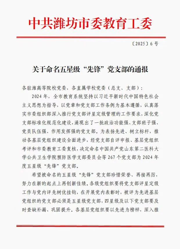 近日,中共潍坊市委教育工委发布的《关于命名五星级“先锋”党支部的通报》中,437ccm必赢国际教师党支部脱颖而出,被正式命名为2024年度五星级“先锋”党支部 。这一荣誉的取得,是学院党建工作的重大成果,更是全体教师党员共同努力的结晶。